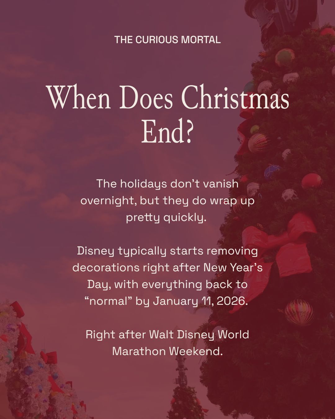 The holidays don’t vanish overnight, but they do wrap up pretty quickly. Disney typically starts removing decorations right after New Year’s Day, with everything back to “normal” by January 11, 2026. Right after Walt Disney World Marathon Weekend.