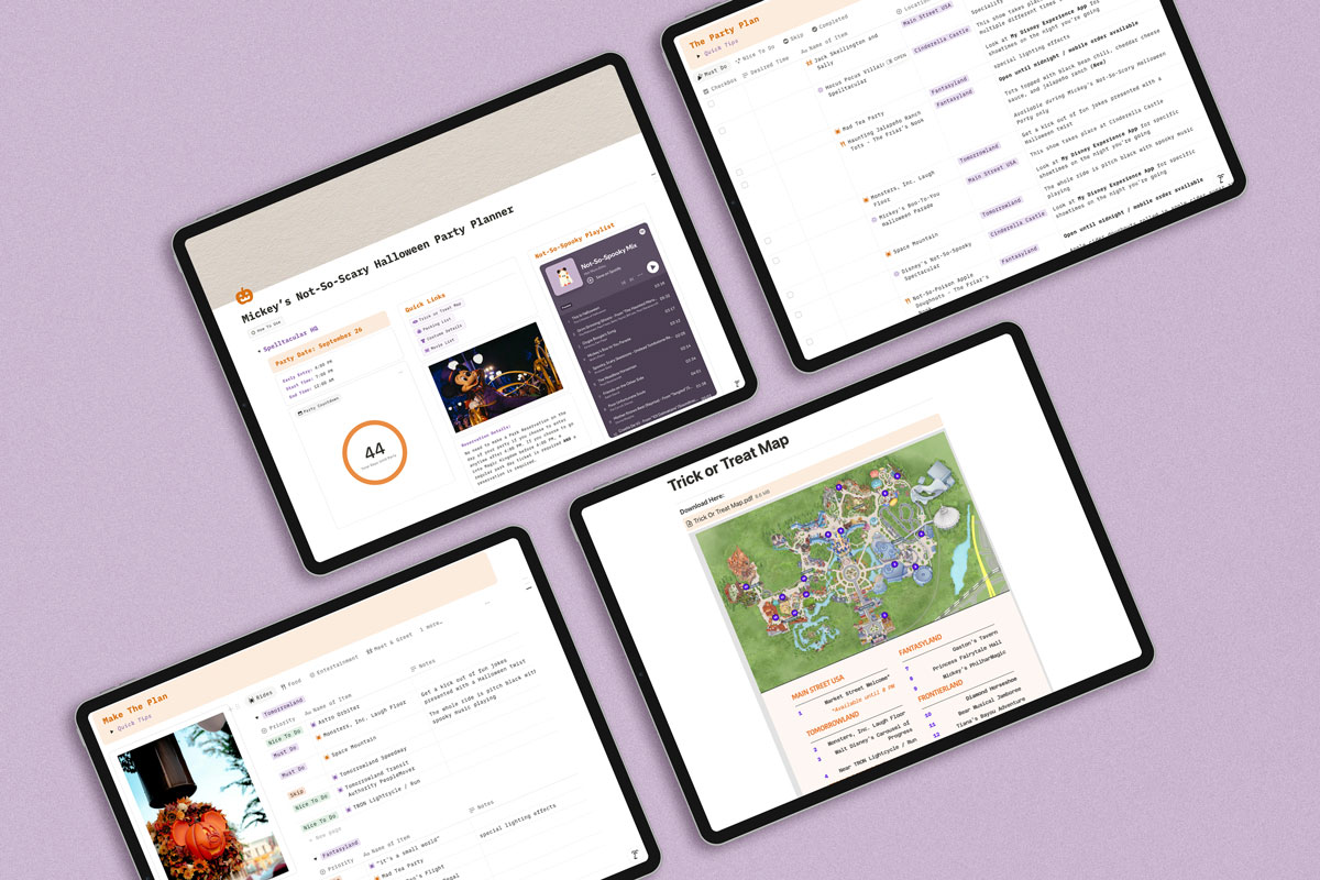 A Notion template that helps you organize your party priorities, character meets, ride overlays, showtimes, and trick-or-treat stops.